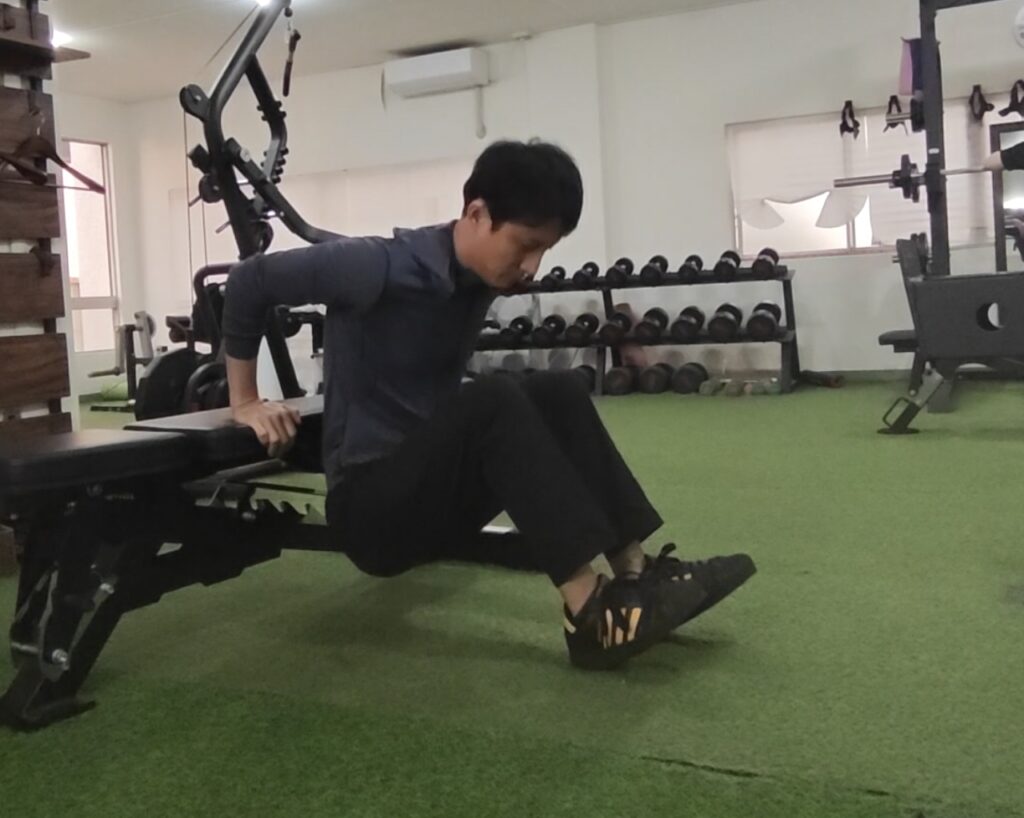 腰が前に出ると負荷が脚に分散されてしまいトレーニング効率が落ちるのと、肩の可動域が広がり過ぎてケガの原因となるなどのデメリットがあります。