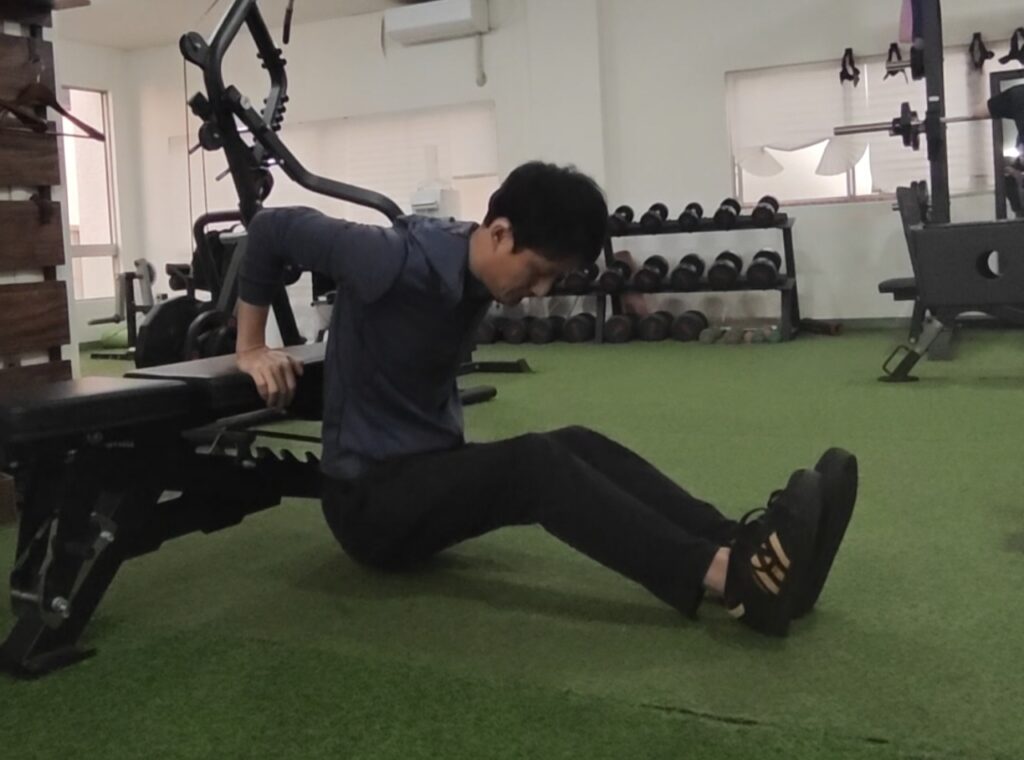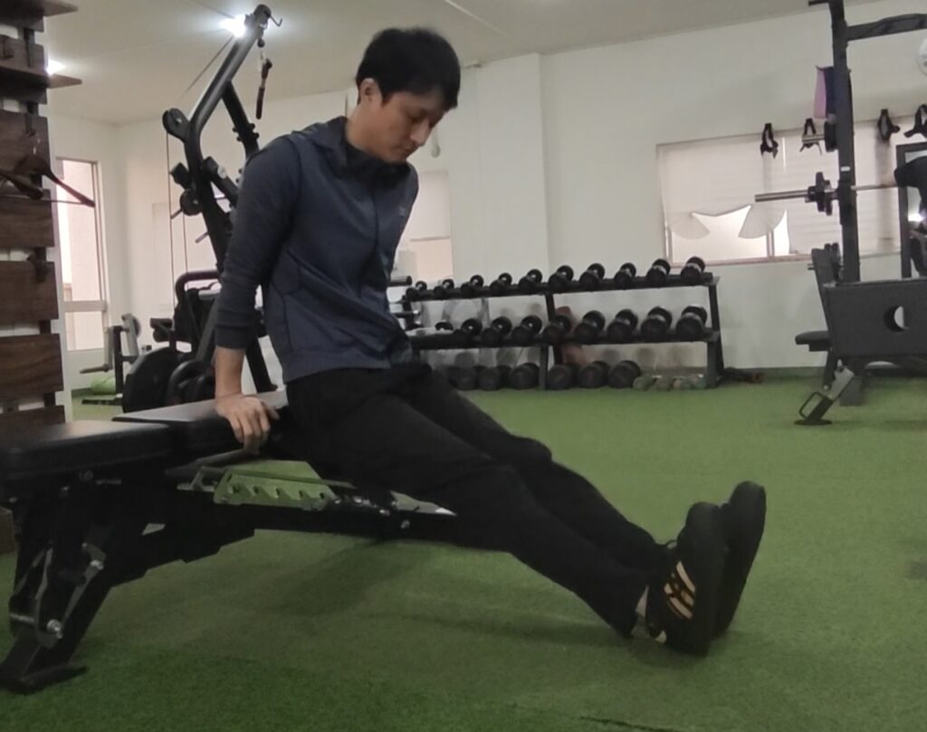 このときのポイントはつま先を少し上げる事です。そうする事であくまでメインの負荷は上腕三頭筋に入る形になりやすいです。